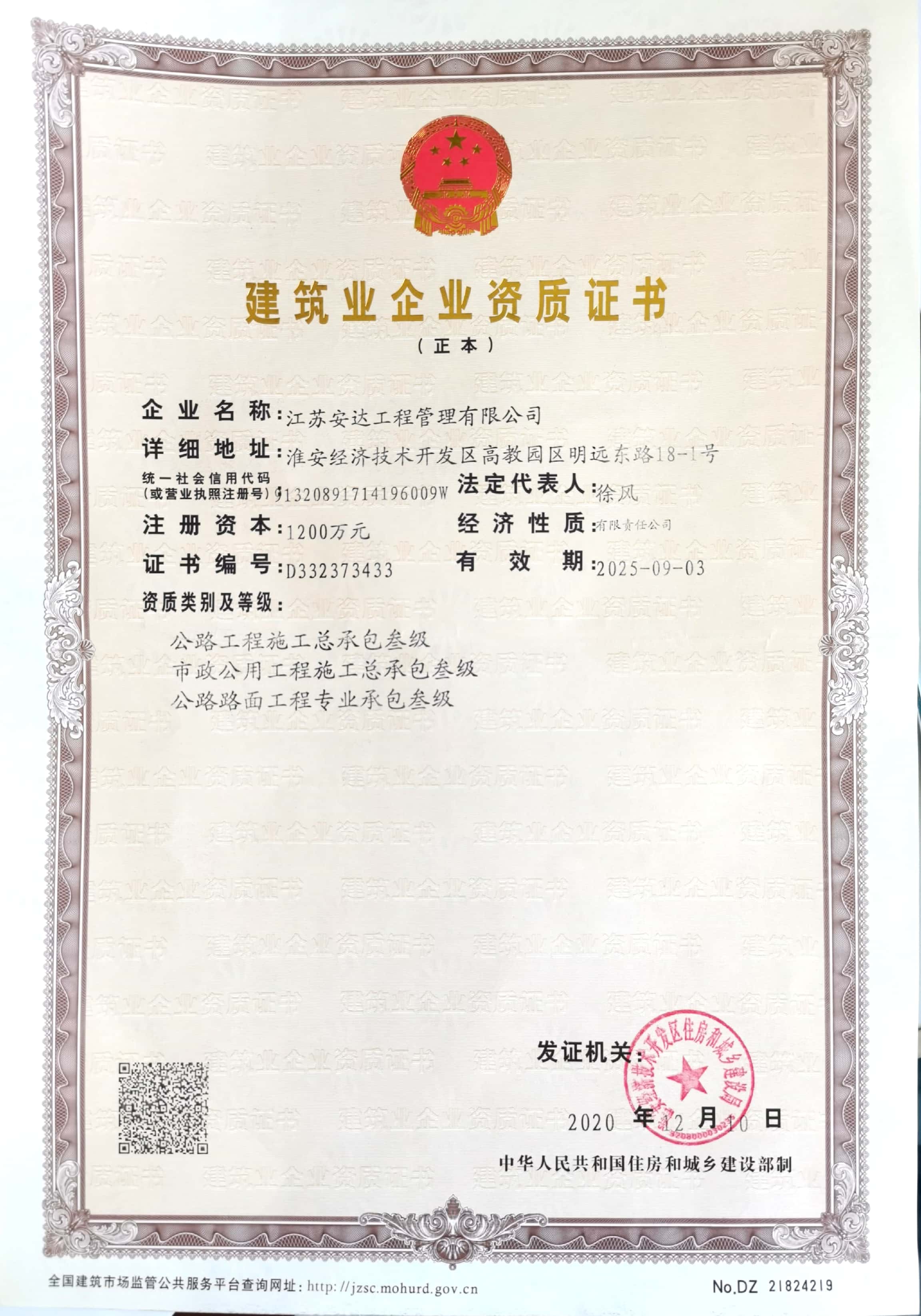 近日,经淮安经济技术开发区住房和城乡建设局审核批准,我星空(中国)顺利获得公路公路施工总承包叁级、市政公用工程 施工总承包叁级、公路路面工程专业承包叁级建筑业企业施工资质证书,标志着我星空(中国)业务服务水平又上了一个台阶,为星空(中国)进一步开拓市场,培育新的经济增长点,实现可持续发展奠定了坚实的基础,是星空(中国)发展史上的又一重要里程碑。