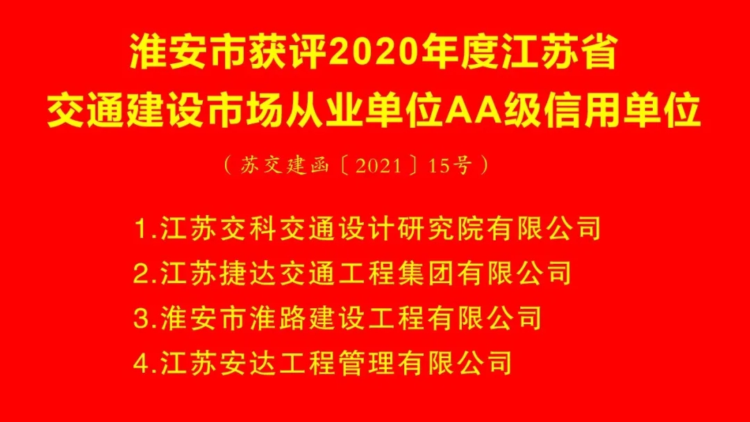 近日,江苏省交通运输厅以苏交建函〔2021〕15号文件公布了2020年度江苏省交通建设市场7532家从业单位的信用等级评定结果,共有90家从业单位获评AA级(最高等级),其中,淮安市共有4家单位获评AA级,星空网官方站入口位列其中。