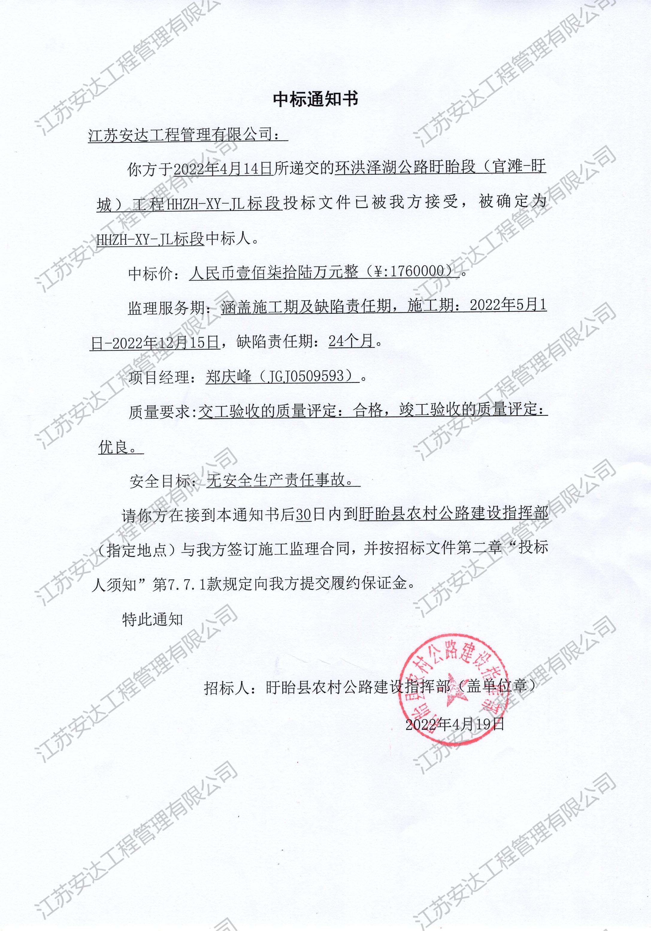 我星空(中国)中标环洪泽湖公路盱眙段(官滩-盱城)工程HHZH-XY-JL标段监理项目