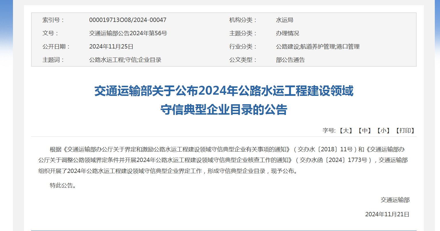 热烈祝贺星空网官方站入口荣获交通运输部2024 年公路工程建设领域守信典型企业