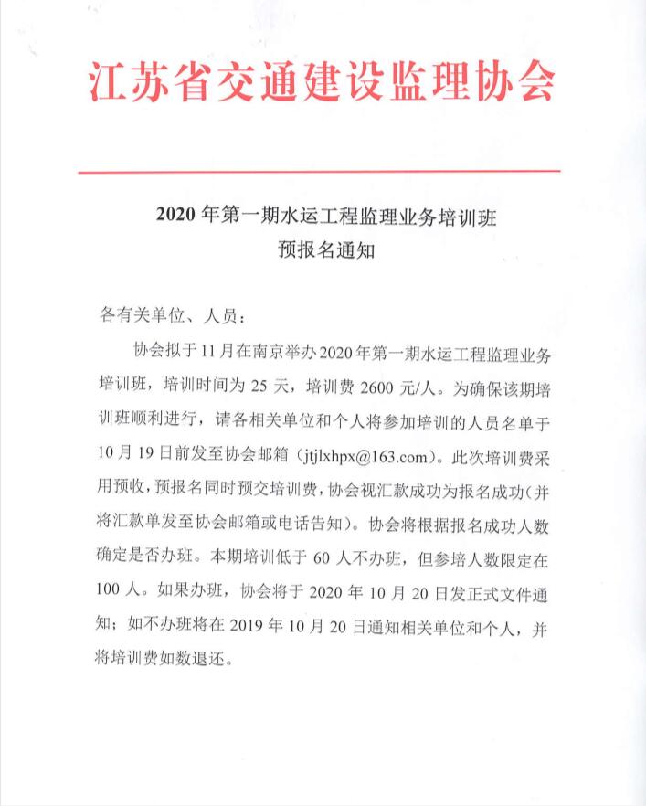 转发2020年第一期水运工程监理业务培训班预报名通知,达到报名条件的同事,请及时报名培训。